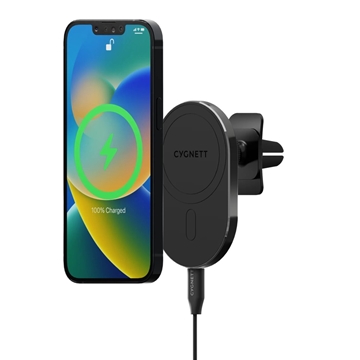 A wireless phone charger and in-car holder that mounts securely to your car’s vent. The magnets built inside this holder perfectly align with MagSafe technology inside iPhone 12 and above, securely attaching your phone while you drive. Mount your phone in the perfect viewing position for navigation, with 180° rotation for adjusting your phone in either landscape or portrait mode.